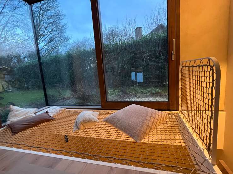 In de zomer kan de schuifdeur lekker open gezet worden zodat je een soort hangmat hebt maar dan in huis!