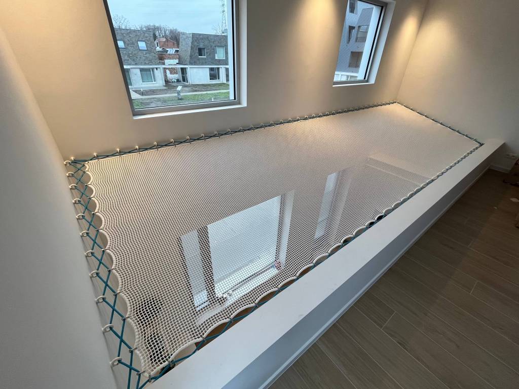 Een heel groot lounge-net met een hele kleine maaswijdte. We gebruikten hier D-harpjes om het net mee te bevestigen en daarnaast de wrijving te verminderen.