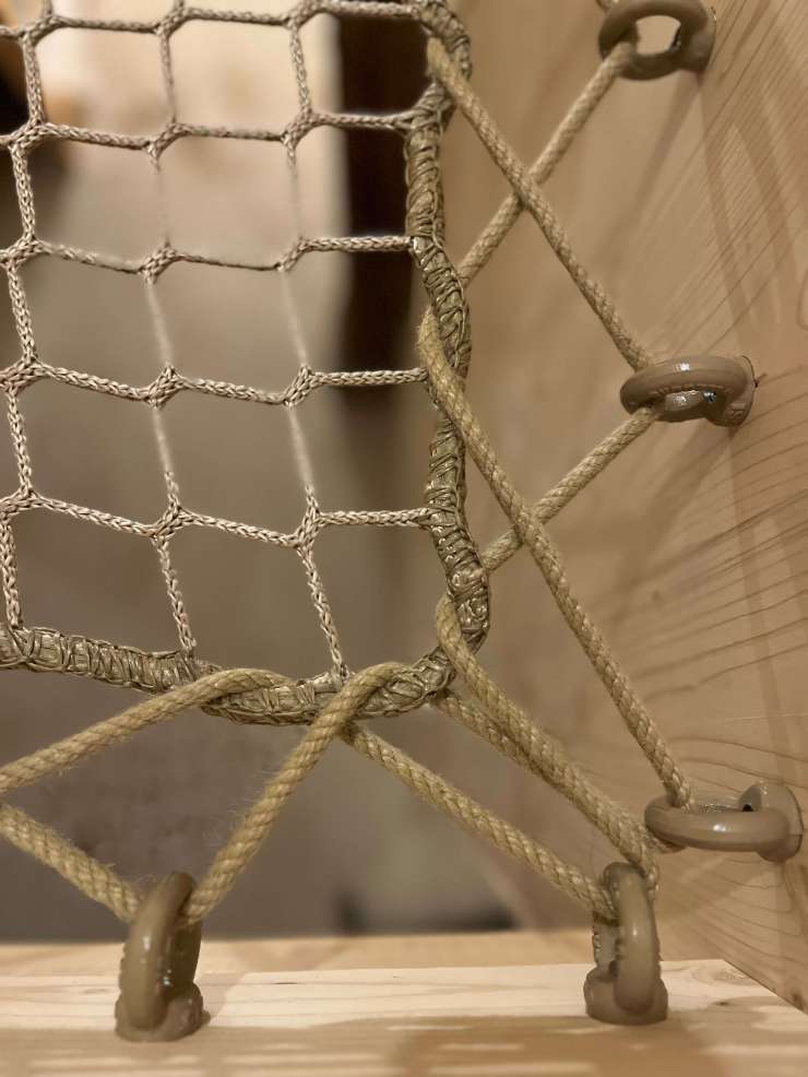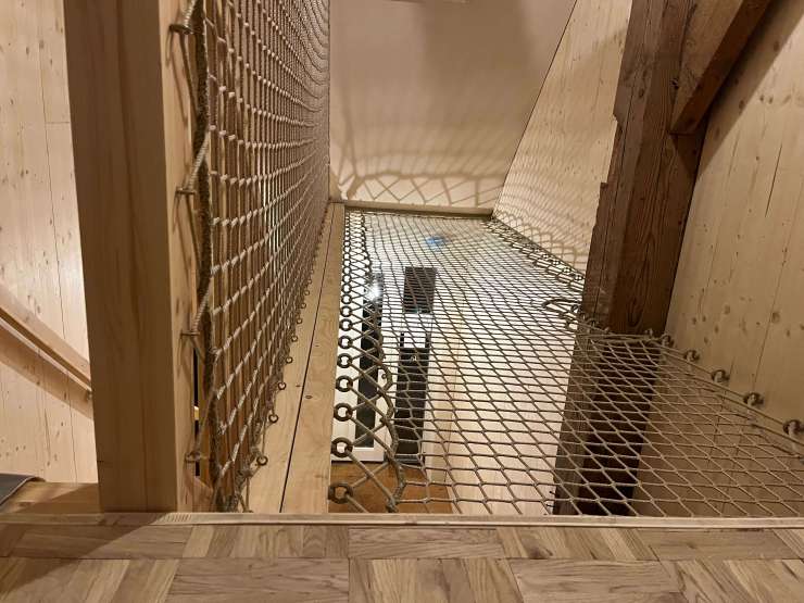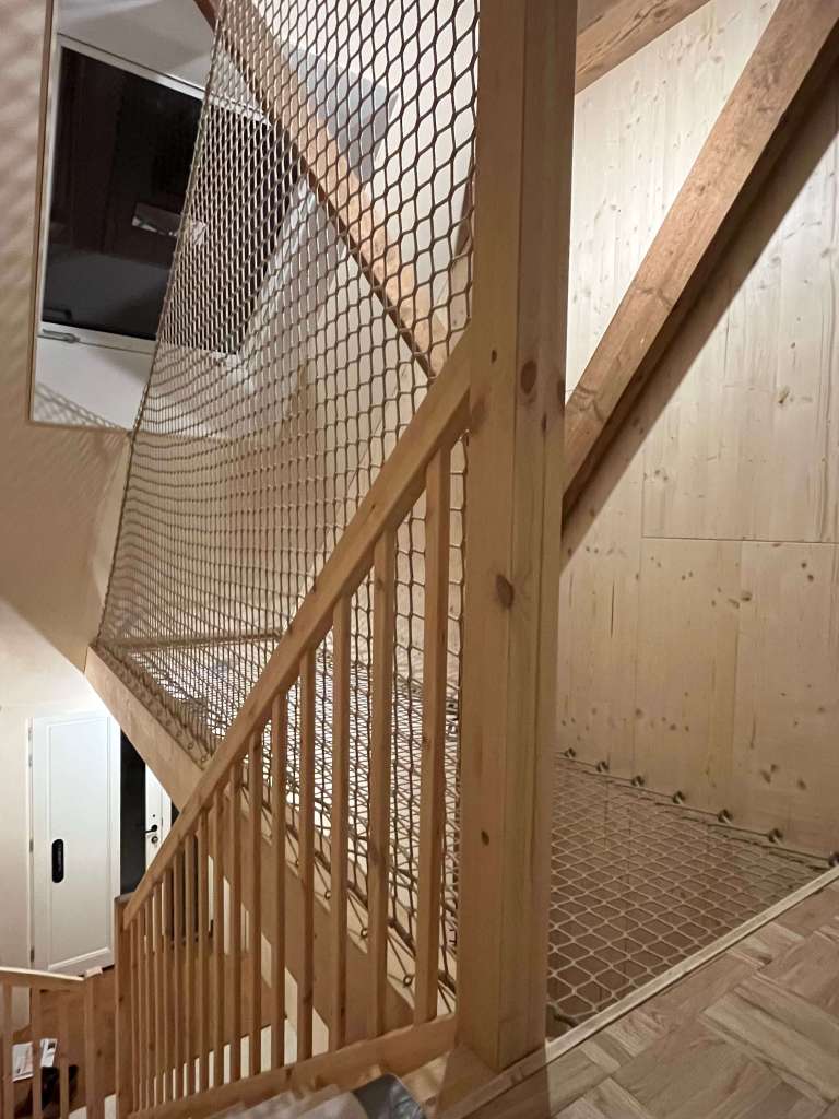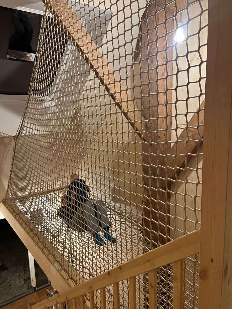 Je stapt zo vanaf de vloer het net in, en om ervoor te zorgen dat je niet van de trap valt hebben we hier een ook groot balustrade-net geplaatst.