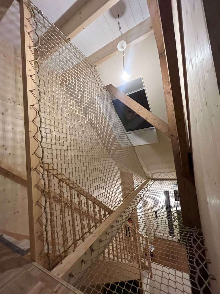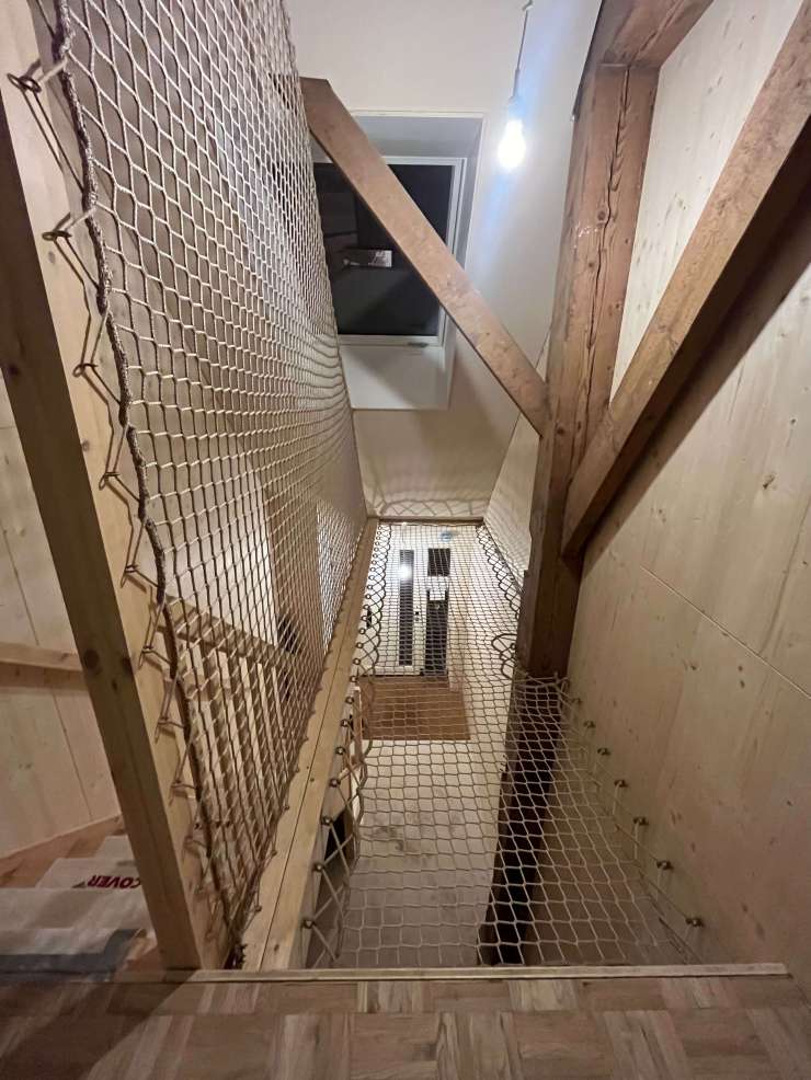 Vroeger was dit de deel waar de koeien nog gestaan hebben, maar nu is dit bij het woonhuis betrokken en om de veiligheid te waarborgen op de bovenste verdieping hebben we hier een net gemaakt.
