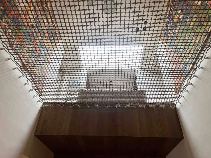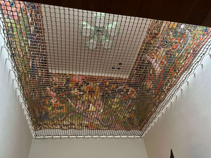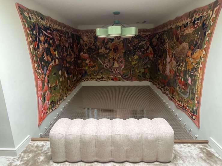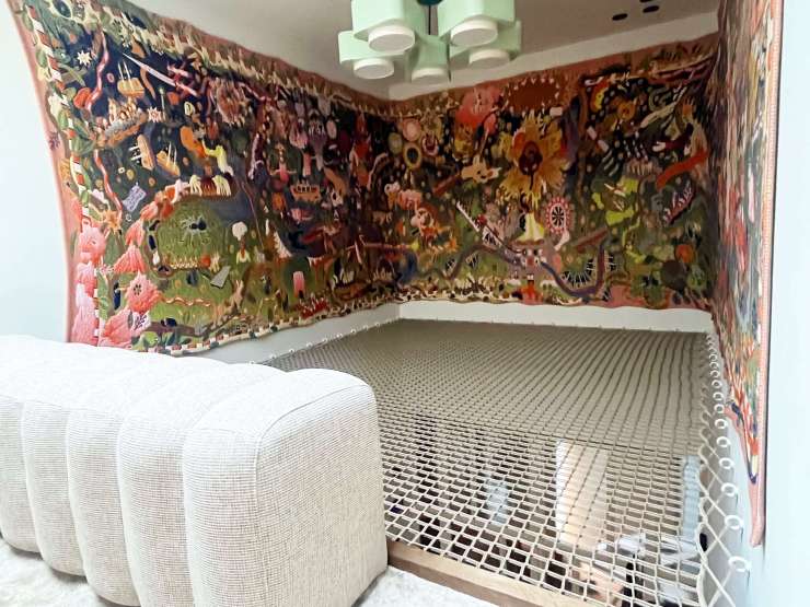 Boven achter het net hangt een kleurrijk wandkleed, al met al is het hier een ware beleving.