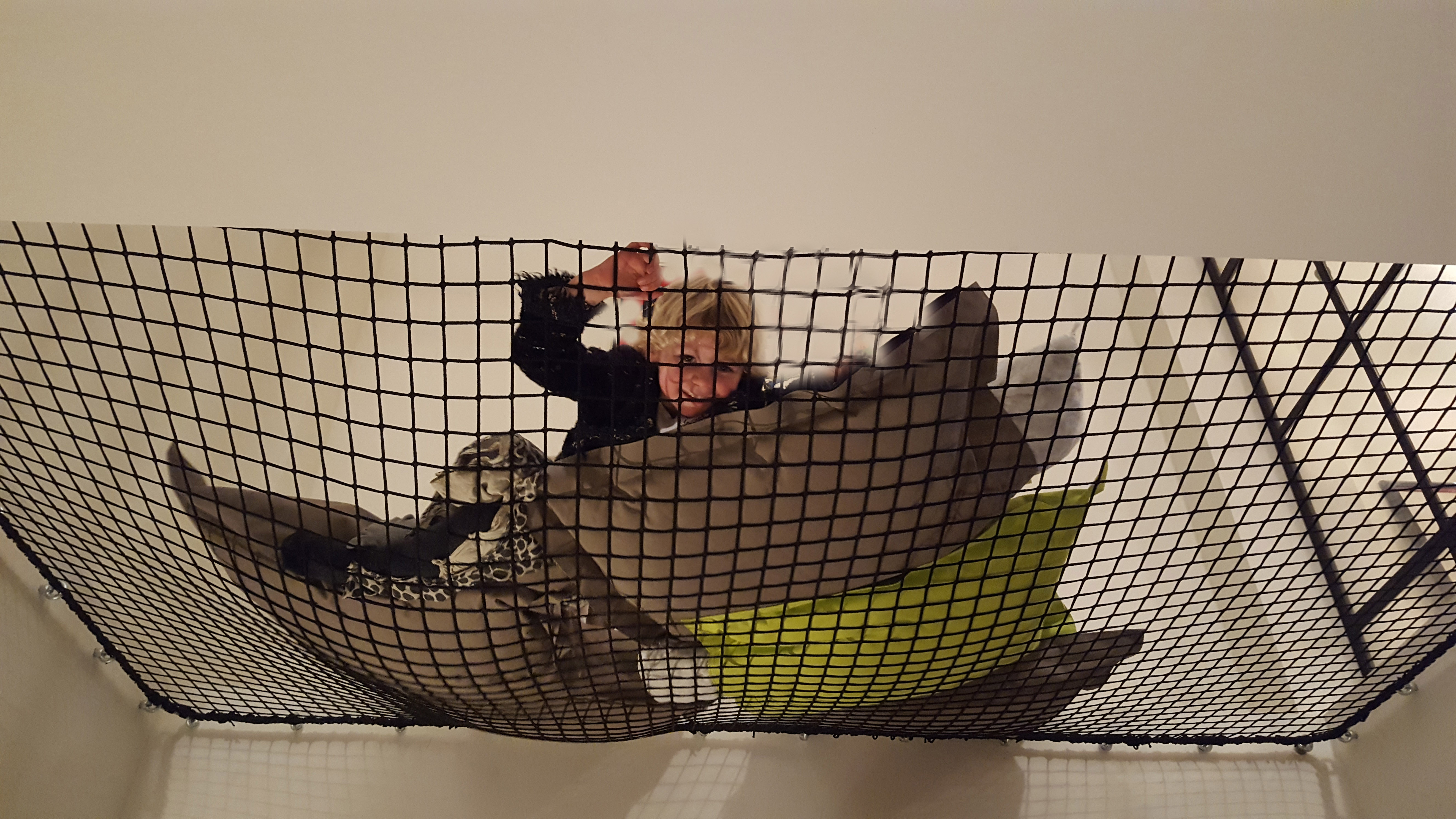 Een groot lounge-net boven een vide. Deze loze ruimte wordt nu fantastisch benut met een mooi lignet. Hier kunnen de kinderen lekker in spelen en ook voor volwassenen is dit een prima plek om je s’avonds terug te trekken met een wijntje en de iPad.