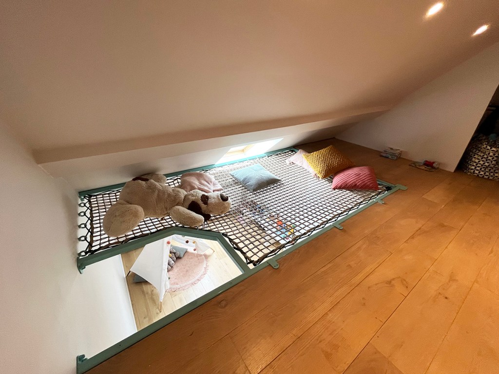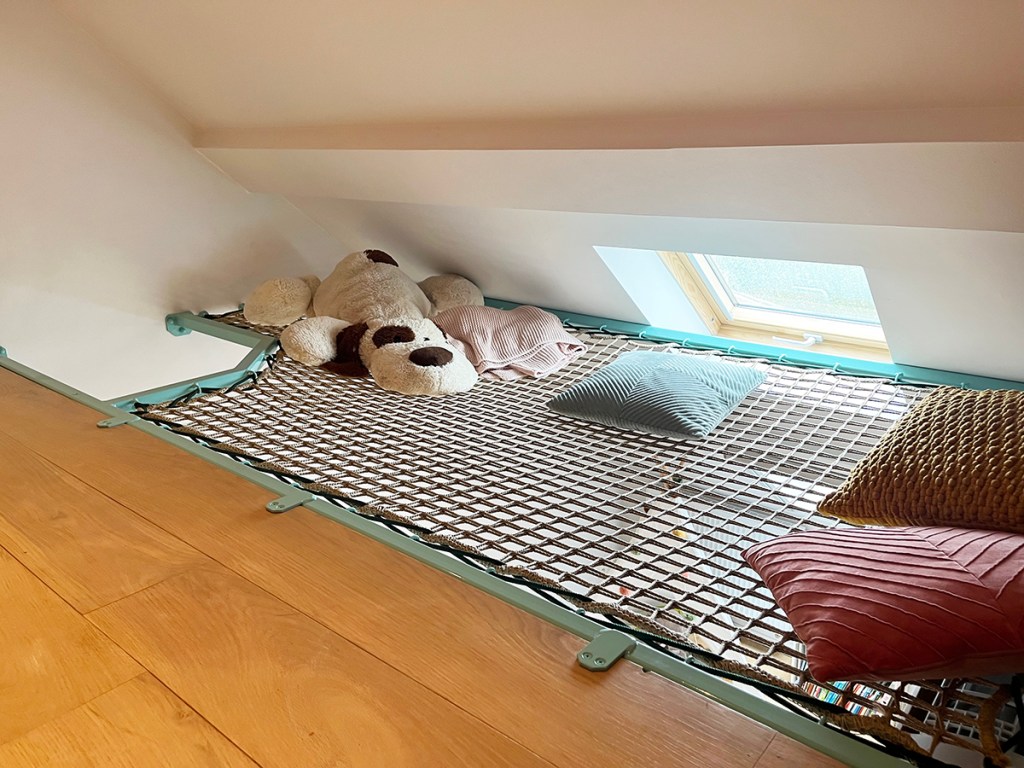 Op het eerste gezicht leek de ruimte aanzienlijk klein door de schuine wanden, maar voor de kinderen blijft er nog voldoende speelruimte over zo en kunnen ze hier toch lekker in liggen.