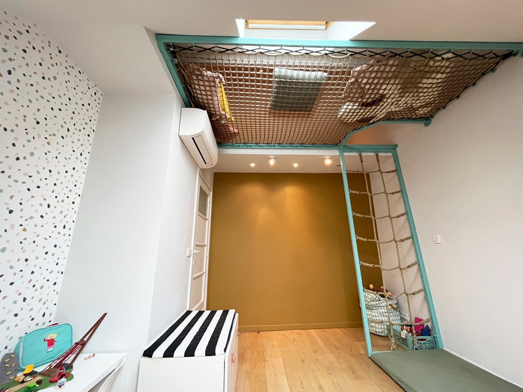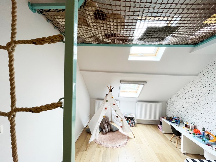 Een leuke speelkamer waar dit lounge-net met klimrek een goede toevoeging bij is.
