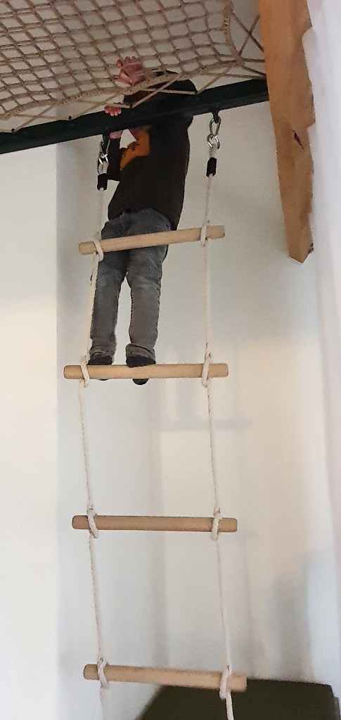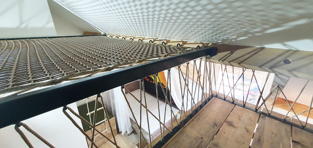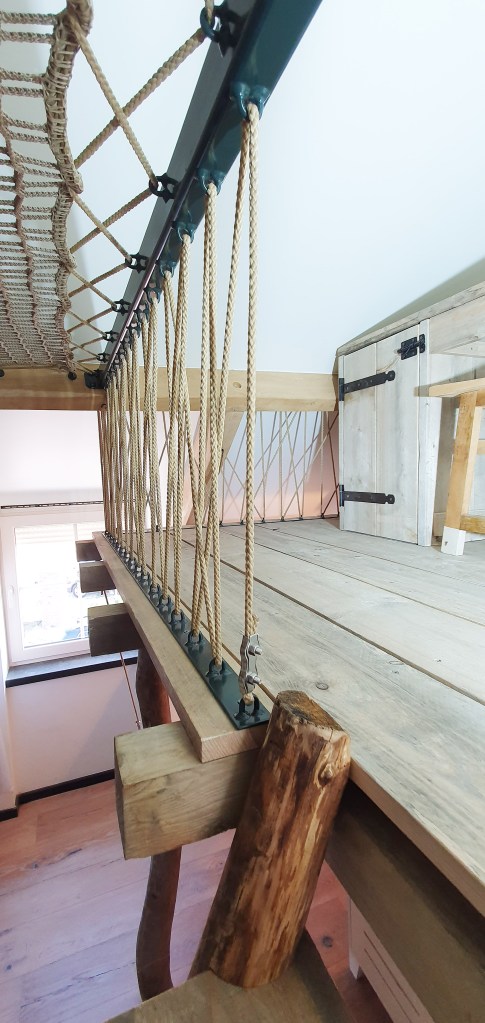 Via de verdiepingsvloer klim je zo het net in en aan de achterzijde kun je via een touwladder weer naar beneden.