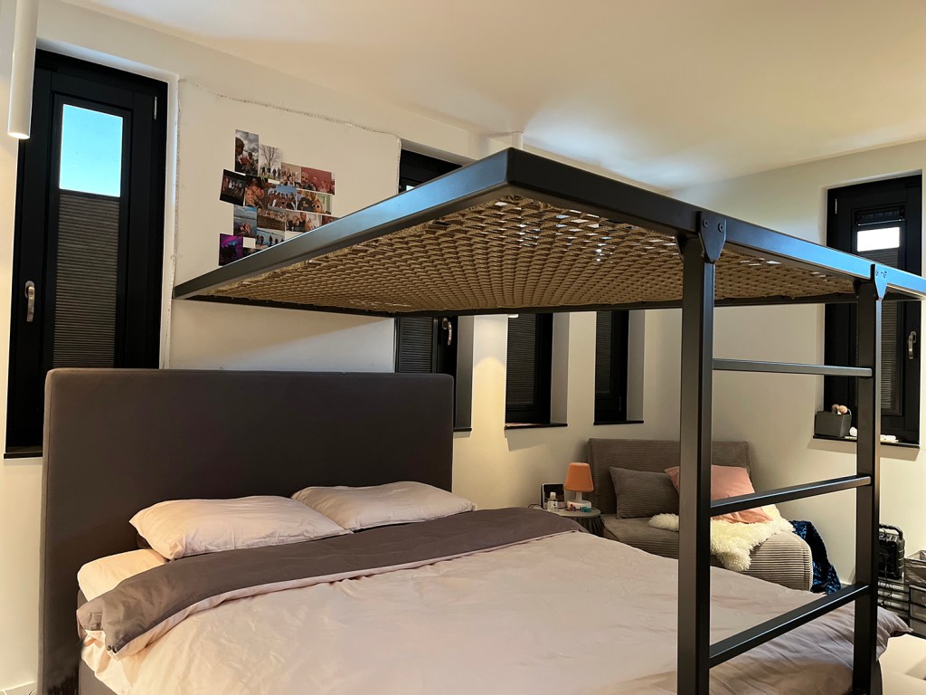 Een echte aanwinst voor deze tienerkamer is deze mooie lounge-net constructie. We maakten dit frame op maat en doordat we het maar aan één zijde bevestigden ziet het er ook nog eens heel chique uit!