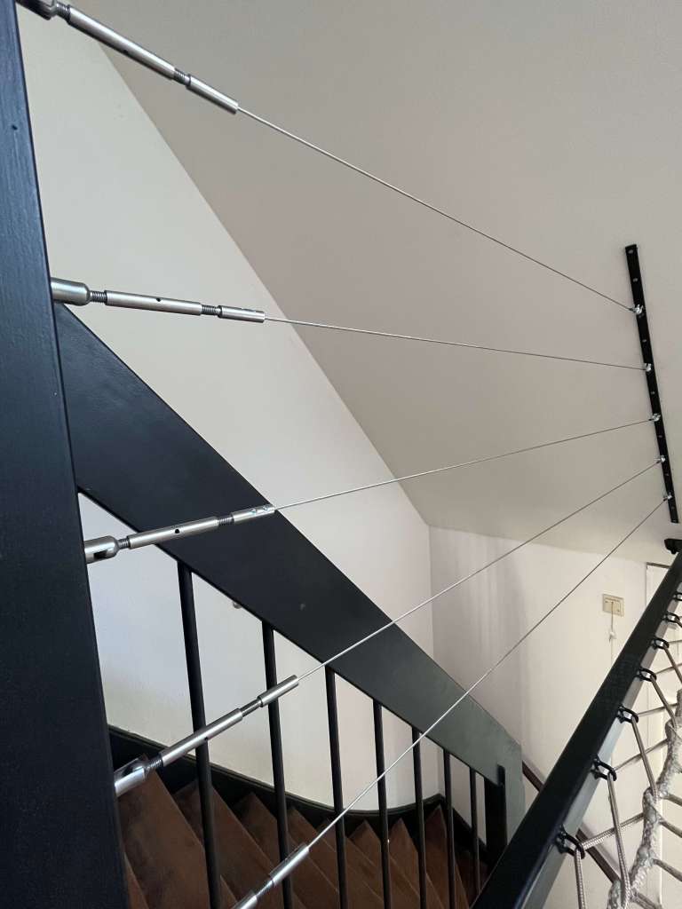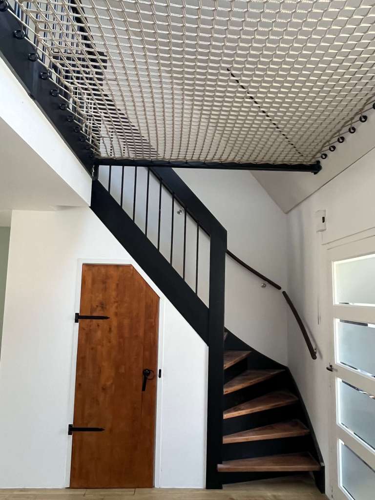 Voor extra veiligheid hebben we meerdere subtiele staalkabels aangebracht zodat de opening naar het trapgat verkleind wordt. Aangezien de kinderen al wat ouder zijn is dit een mooie oplossing om de veiligheid te waarborgen en wat tegelijkertijd niet afdoet aan het ontwerp.