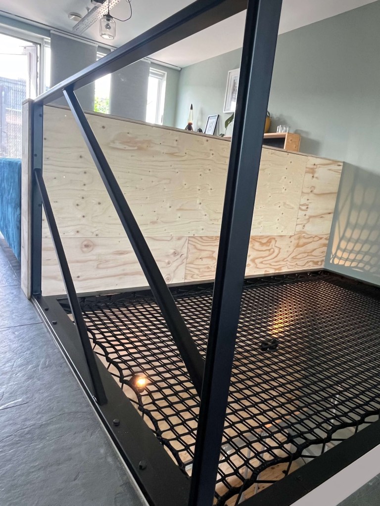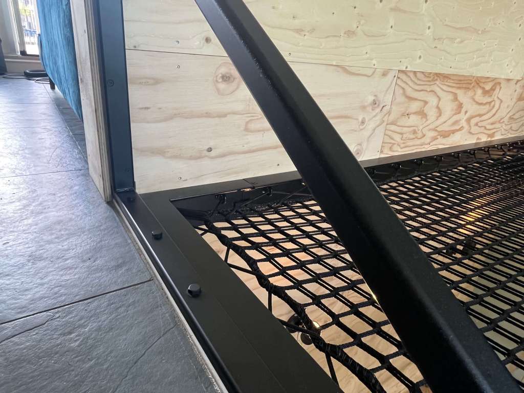 Een lounge-net als deze heeft rondom een stalen frame nodig. Bij dit frame was er de wens om aan de zijkant een extra hekwerk te plaatsen dus hebben we dit gelijk meegelast.